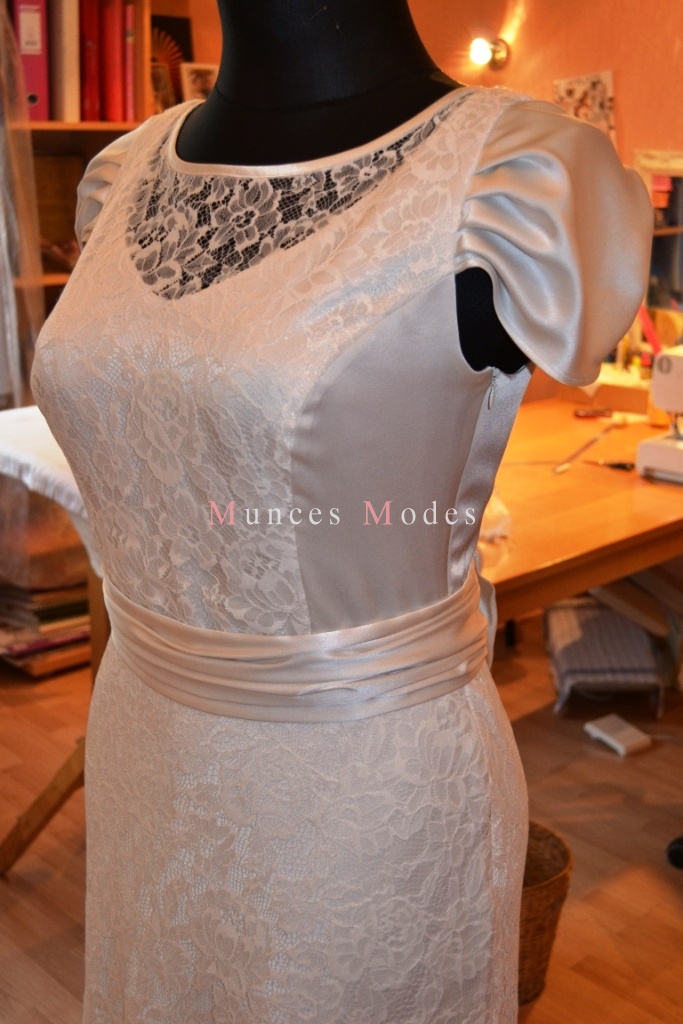 Smalka zīda kleita sudraba nokrāsā slīpā diegā, aizdare sānā, dekoratīva jostiņa - bante, pa virsu mežģīne, oriģinālas piedurknes un bolero jaciņa bez oderes!