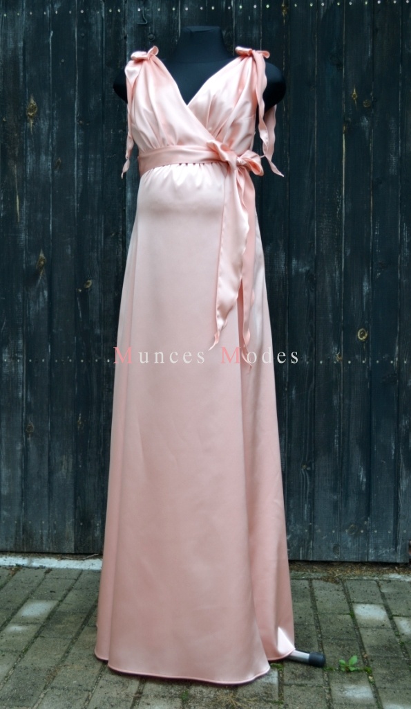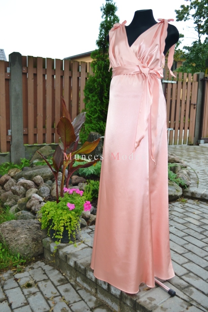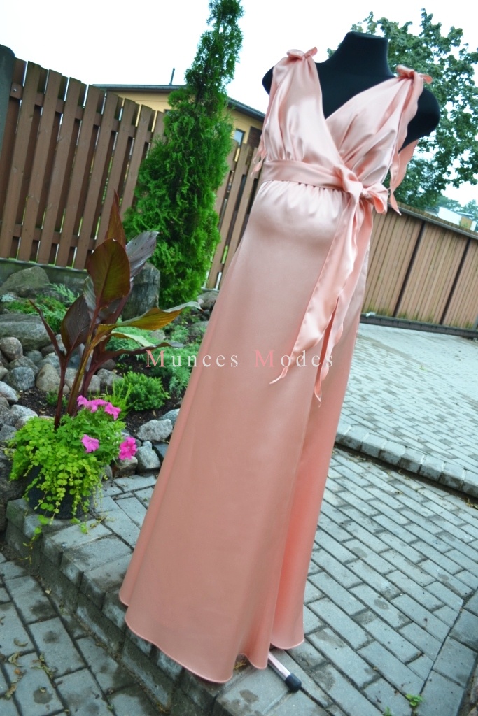 Streč-atlasa vedējmātes kleita persiku krāsā! A-silueta svārku daļa, dekoratīvas bantītes, odere. Komplektā ar kaklasaiti vedējtēvam. Vasara 2012