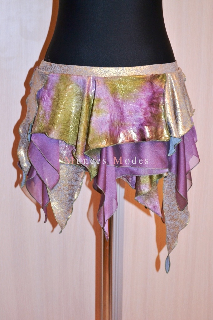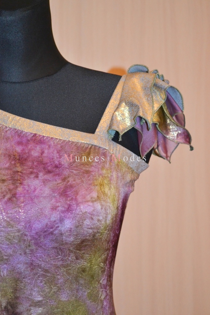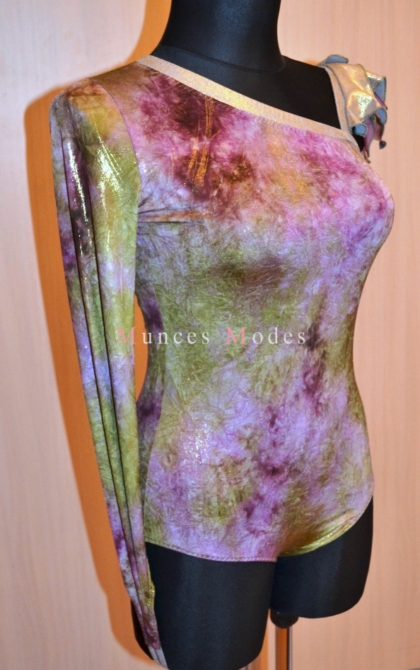 Daiļslidotājas tērps no zeltītas trikotāžas, šifona un raiba pamatauduma.