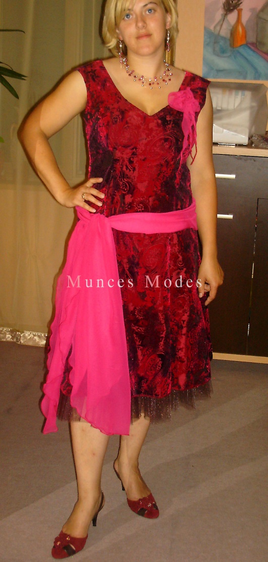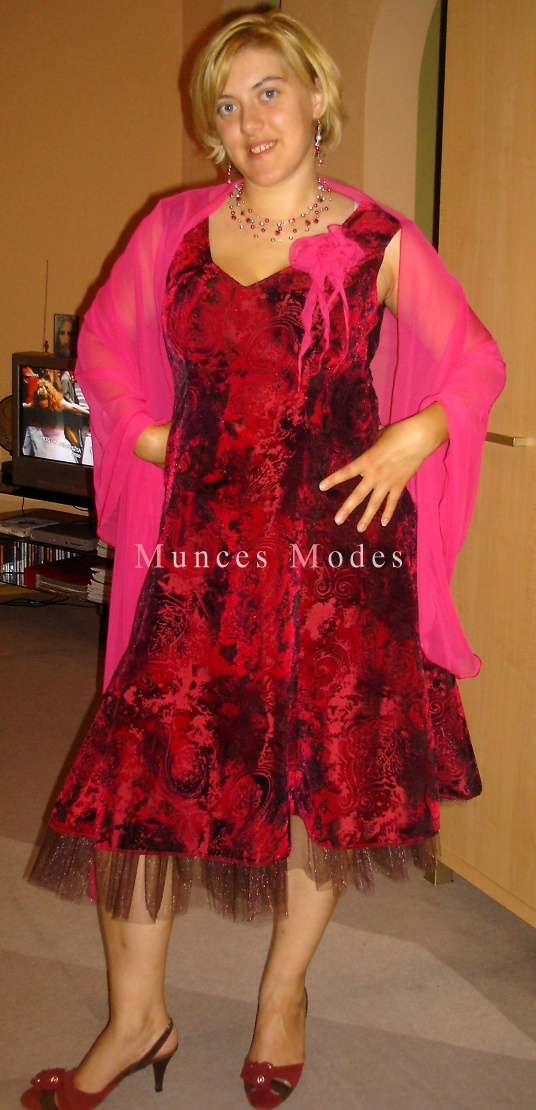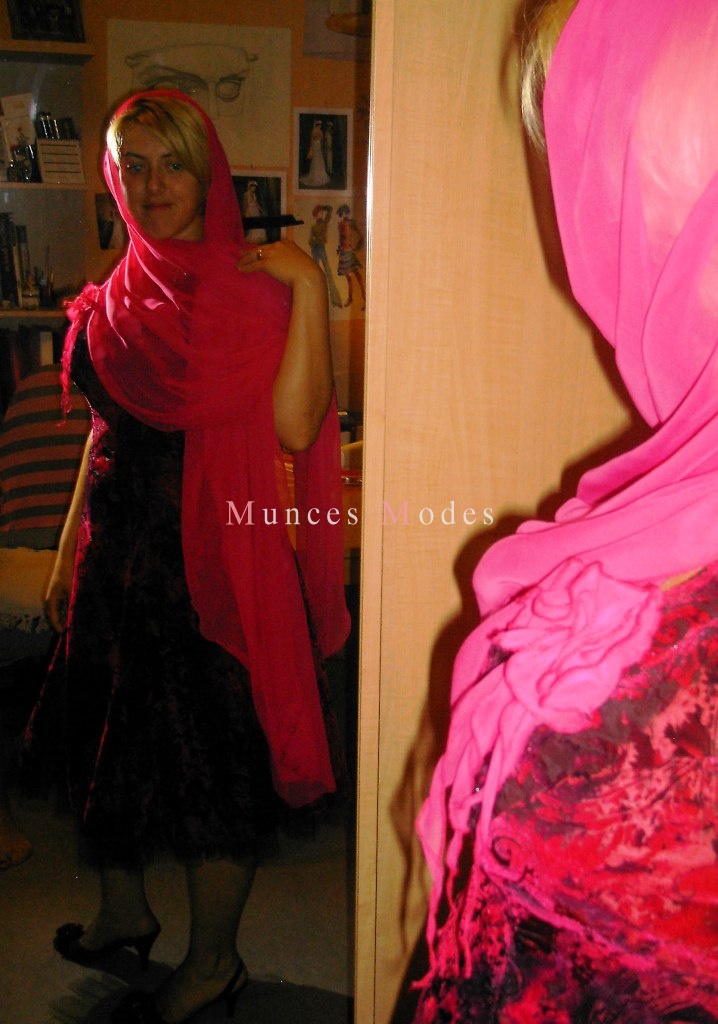 Dekoratīva bordo kleita, plecu lakats, zieds.