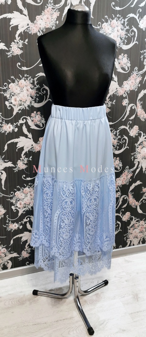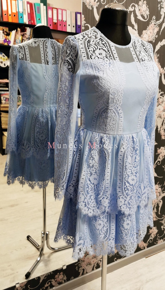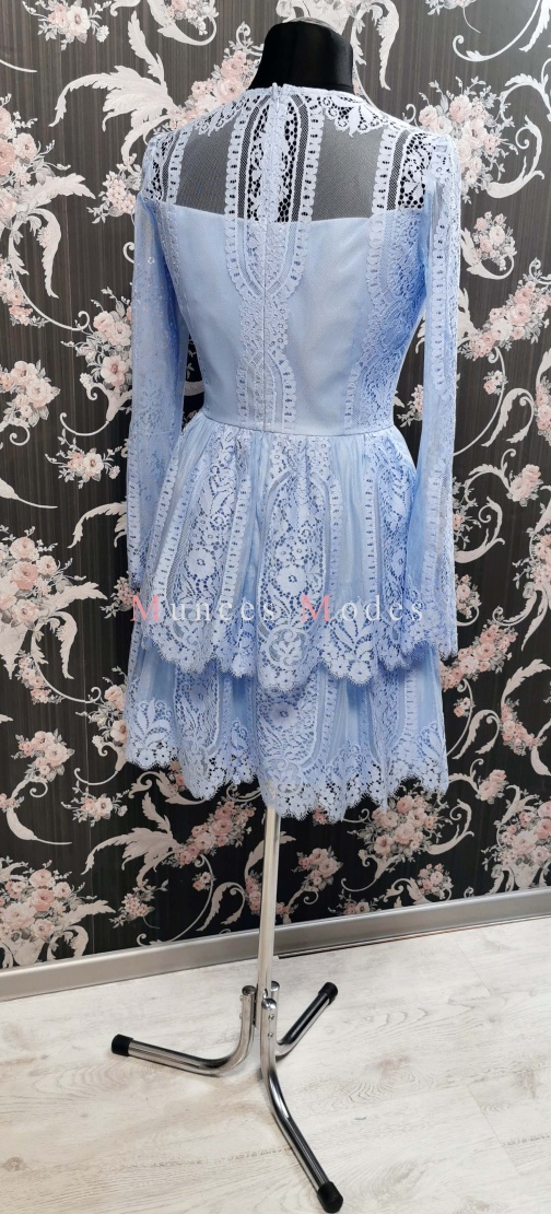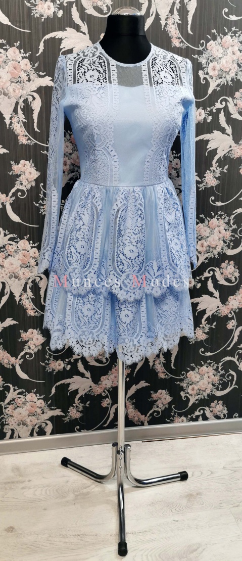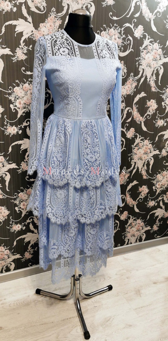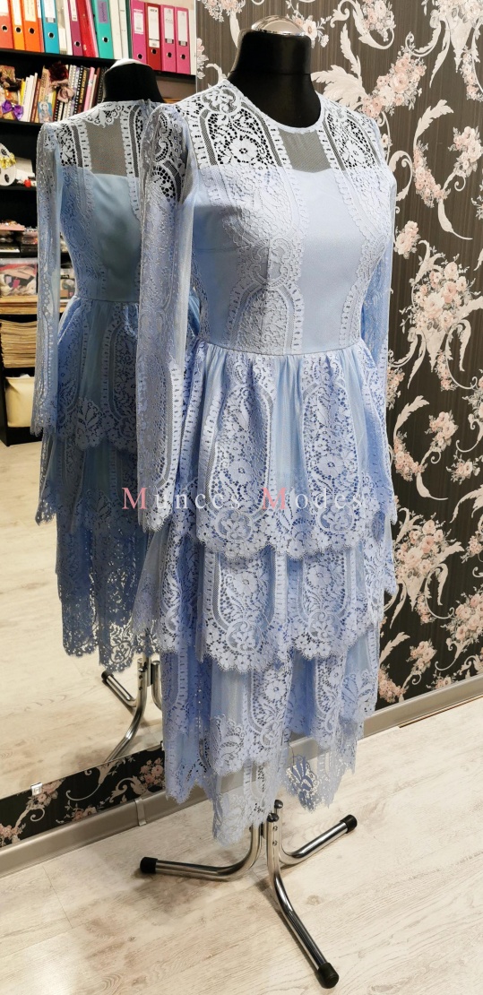 Zila mežģīņu kleita ar volāniem. Apakšsvārki ar papildu volāniem pārveido kleitu no mini uz midi garuma kleitu. Ziema 2020