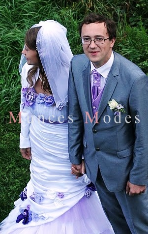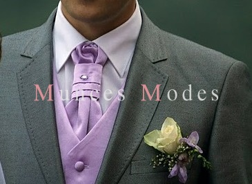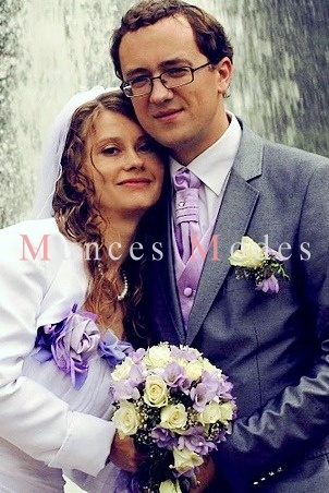 Kāzu komplekts līgavainim no violeta atlasa auduma: - klasiska veste ar apsvilktām pogām un spiciem stūriem apakšmalā; - kraavate ar sīduli; - krūšu kabatas lakatiņš. Vasaras 2010