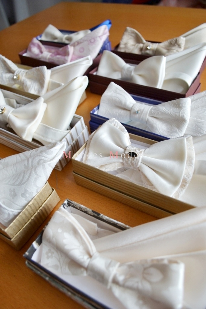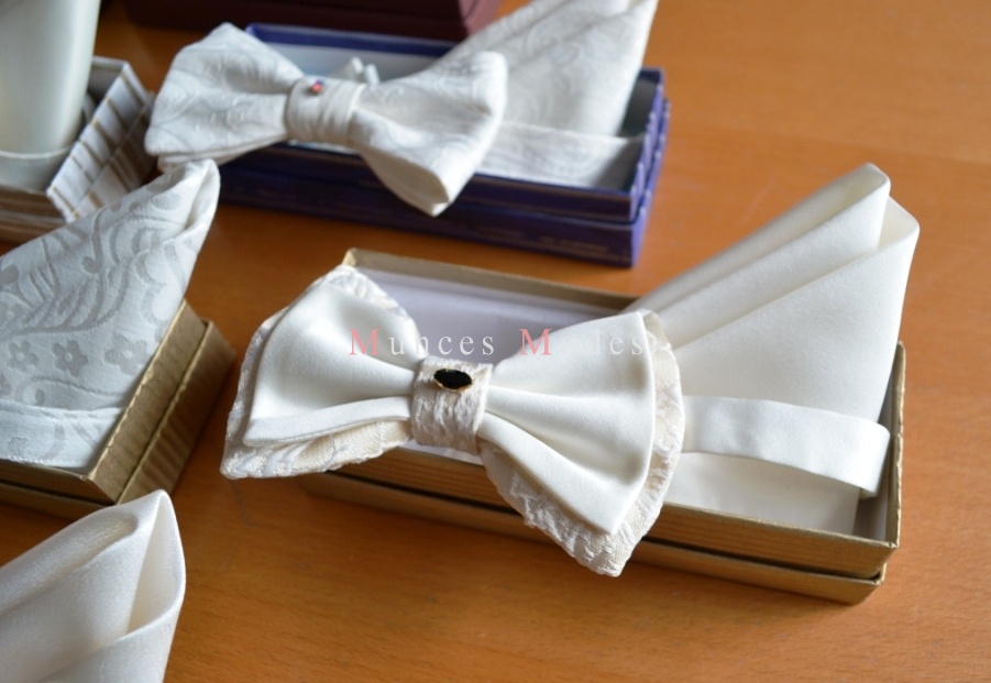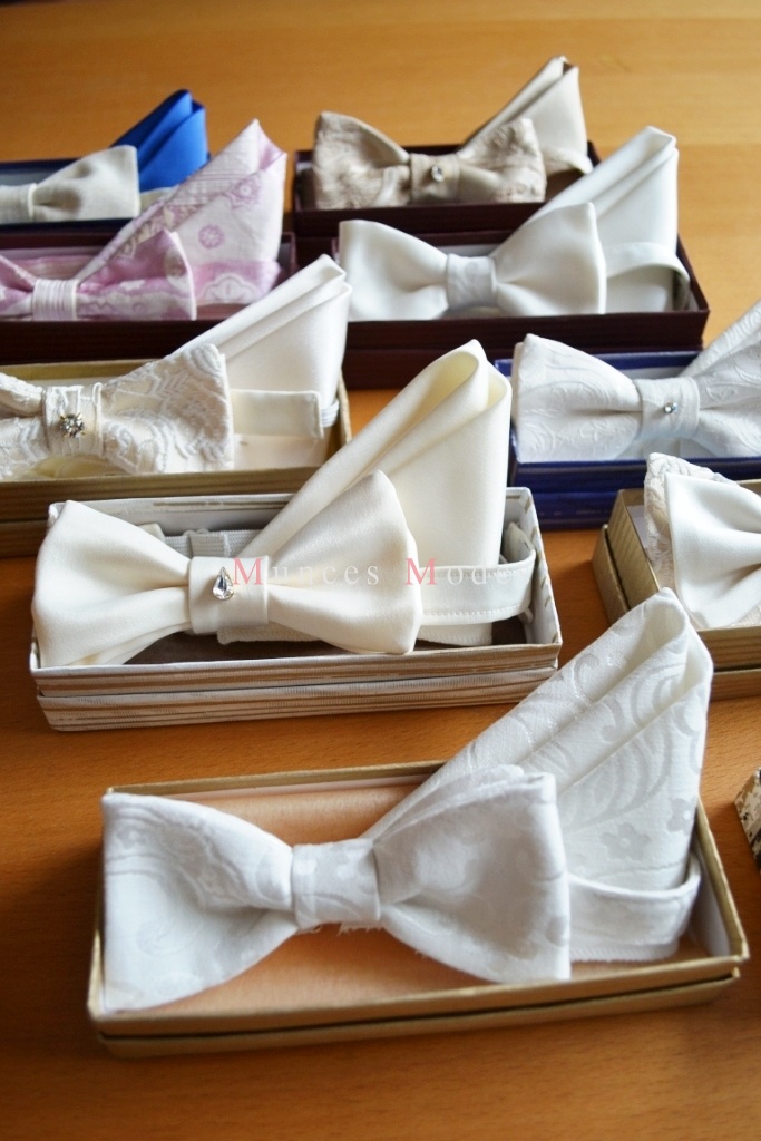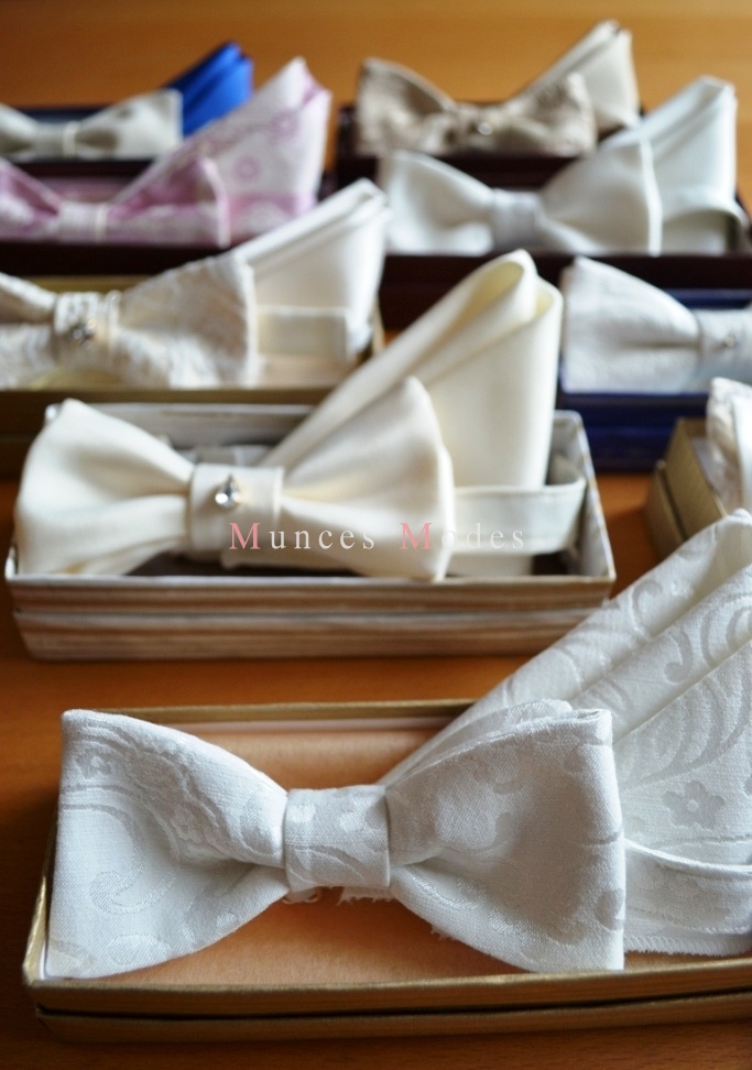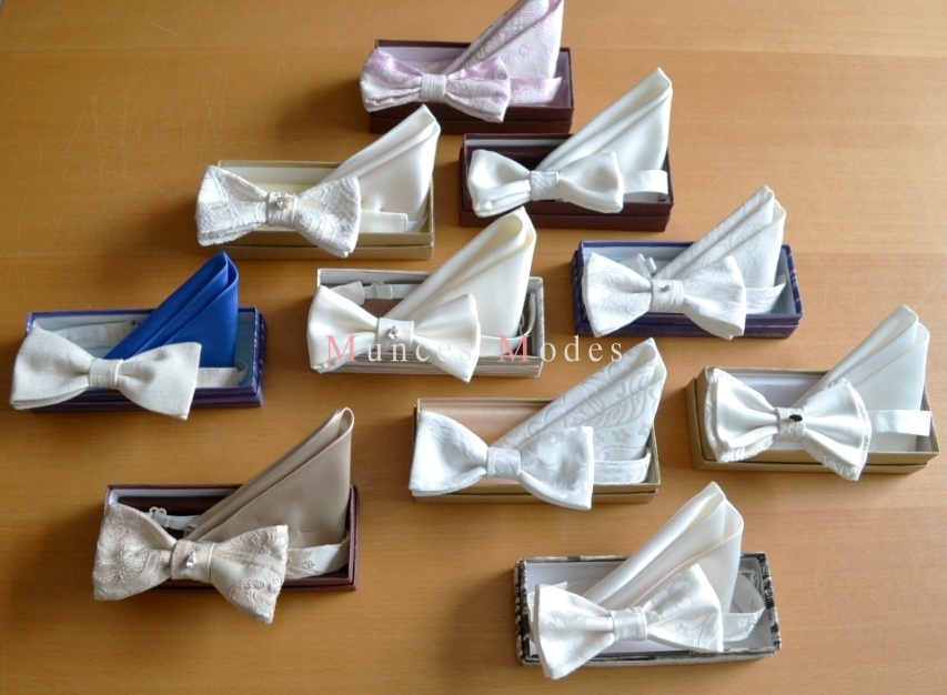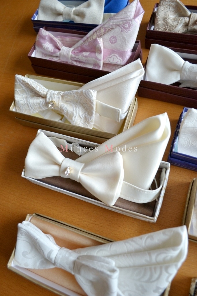 Dažādi tauriņu komplekti ar Swarovsky elemntiem, regulējami. Zīds, lins, satīns, kokvilna. Šampanieša, pienbalti, sniegbalti un citos toņos. Dāvanu kastīte ar zīdpapīru.