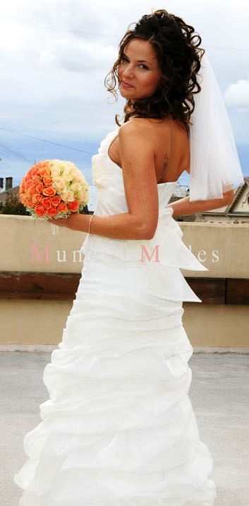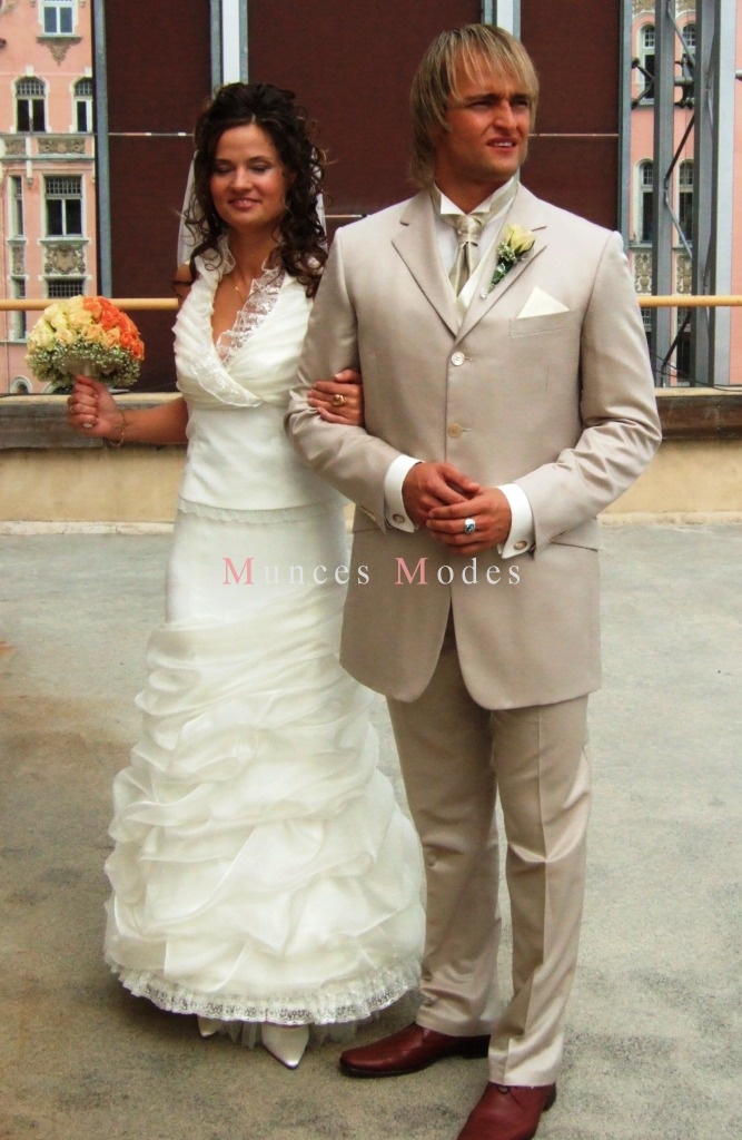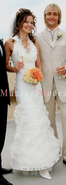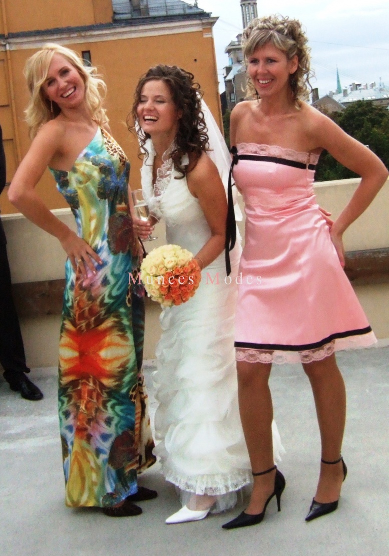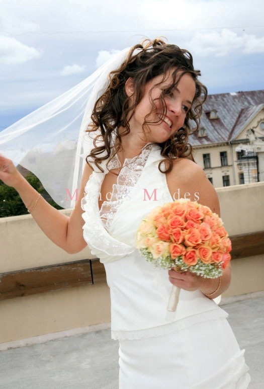 Fraņču stila kleitiņa. Pieguļoša, divadļīga, ar dažādām mežģīnēm; organzas savilkumi un bante. Mākslīgās kažokādas bolero.