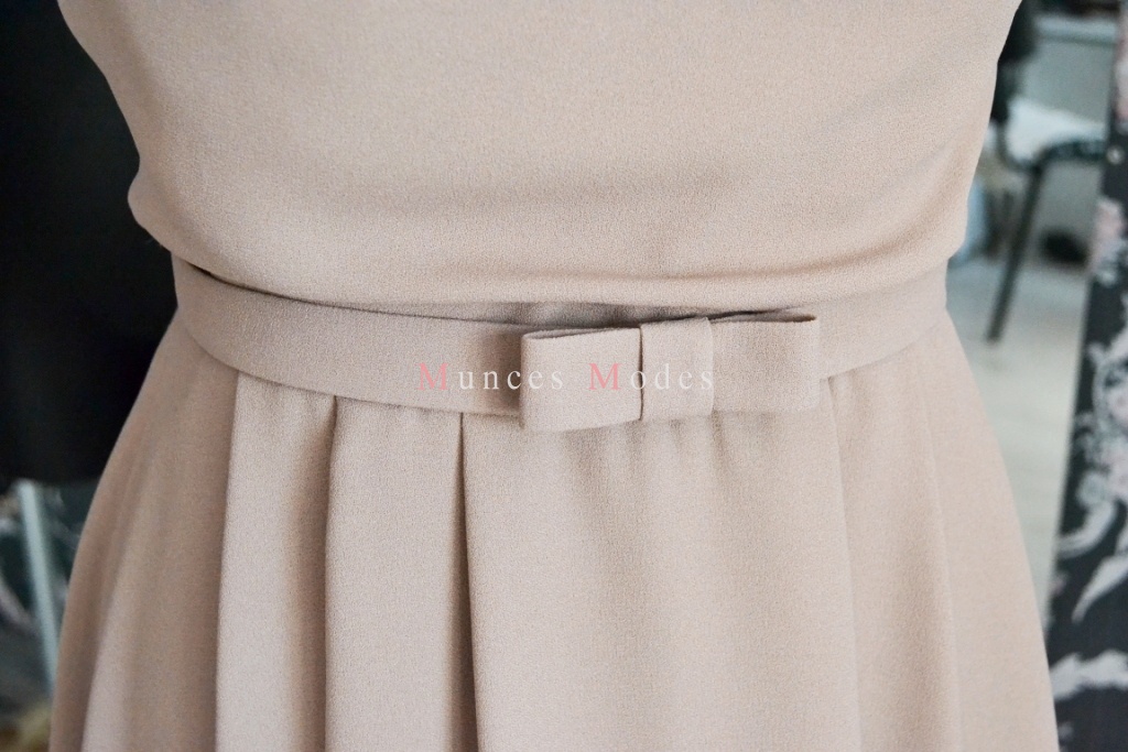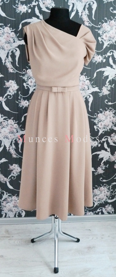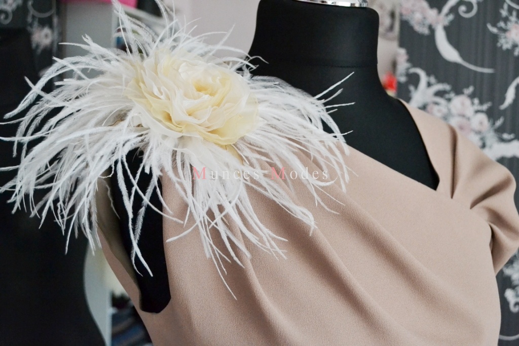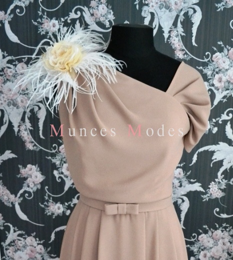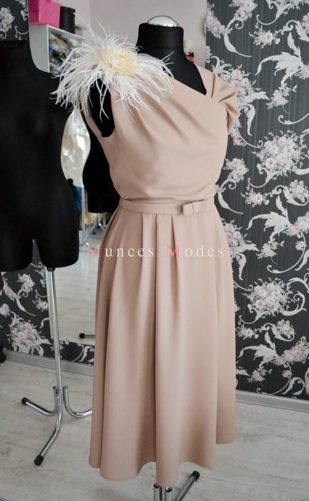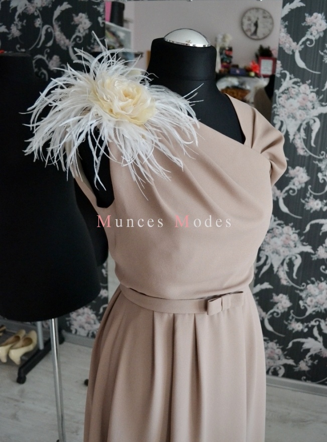 Kakao krāsa kāzu kleita, drapēta, asimetriska, midi garums. Rozes, pāvu spalvas un josta. Maijs 2016