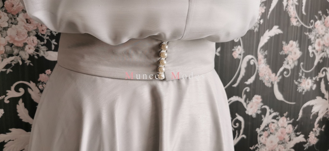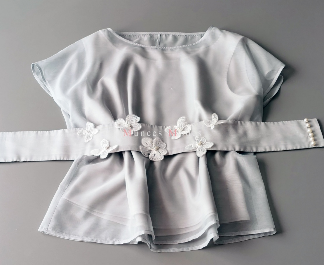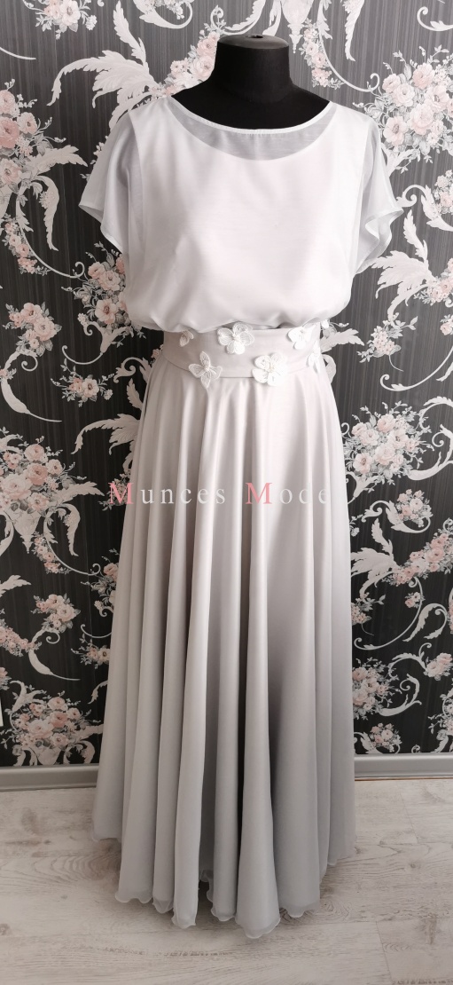 Maigi pelēka daudzslāņaina kādu kleita: tops, saules griezuma svārki un josta. Vasara 2023